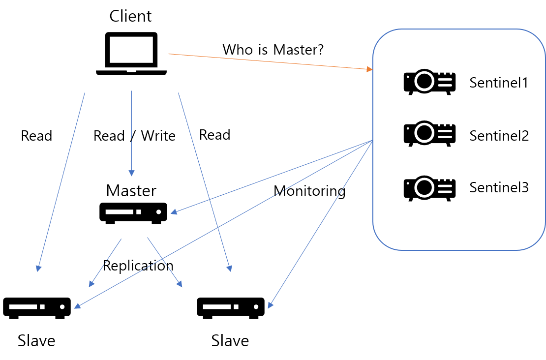 - 3대의 Sentinel이 모든 노드를 감시하고 있다가, 장애 발생시 3대의 Sentinel중에 과반수 이상 동의를 하면 Auto Failover가 진행된다.