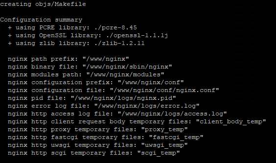 $ ./configure --prefix=${nginx디렉토리경로} --user=web --with-zlib=${zlib 경로} --with-pcre=${pcre 경로} --with-openssl=${openssl 경로} --with-http_ssl_module --with-http_stub_status_module --with-http_realip_module