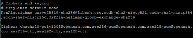 | 조치사항 | # /etc/ssh/sshd_config 아래 키교환 알고리즘 및 암호화 방식(Ciphers) 지정 ![]() |
