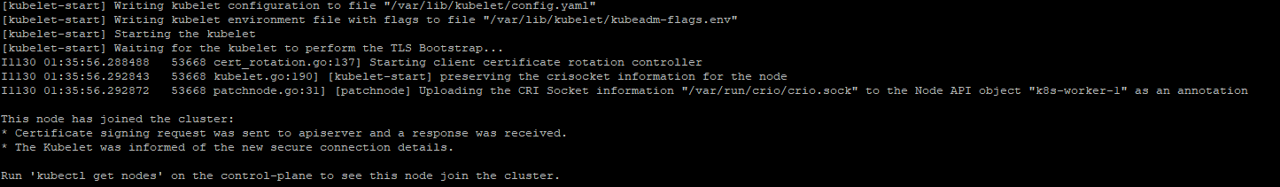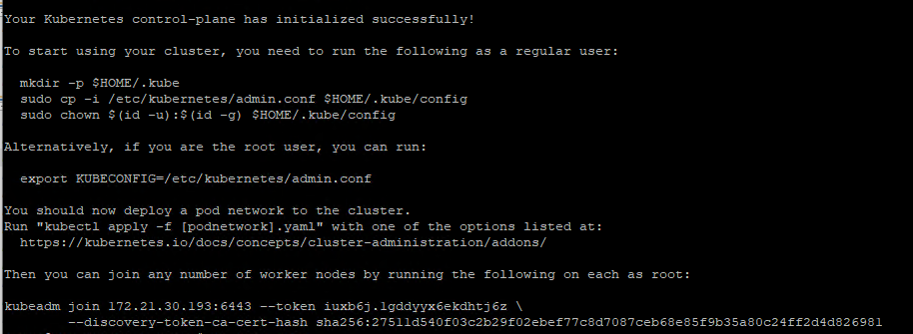 | Your Kubernetes control-plane has initialized successfully! To start using yout cluster, you need to run the following as a regular user: mkdir -p \$HOME/.kube sudo cp -i /etc/kubernetes/admin.conf \$HOME/.kube/config sudo chown \$(id -u):$(id -g) $HOME/.kube/config Then you can join any number of worker nodes by running the following on each as root: kubeadm join 172.31.0.100:6443 --token (TOKEN) --discovery-token-ca-cert-hash (DISCOVERY_HASH) |