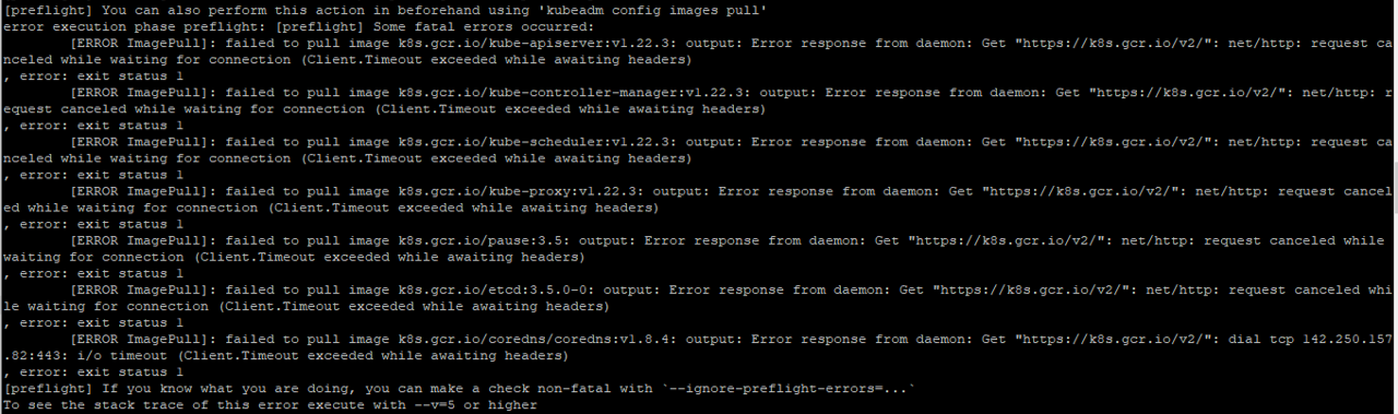 [ERROR ImagePull]: failed to pull image k8s.gcr.io/kube-controller-manager:v1.22.3: output: Error response from daemon: Get "https://k8s.gcr.io/v2/": net/http: request canceled while waiting for connection (Client.Timeout exceeded while awaiting headers)