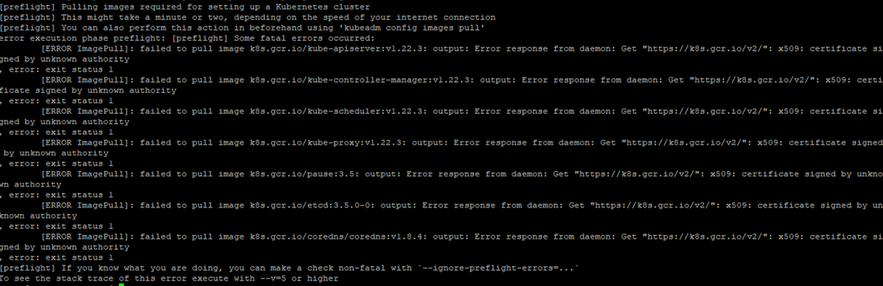[ERROR ImagePull]: failed to pull image k8s.gcr.io/kube-controller-manager:v1.22.3: output: Error response from daemon: Get "https://k8s.gcr.io/v2/": x509: certificate signed by unknown authority