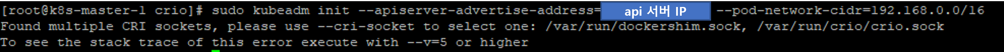 kubeadm init --apiserver-advertise-address=<api 서버 IP> --pod-network-cidr=192.168.0.0/16 --cri-socket /var/run/crio/crio.sock