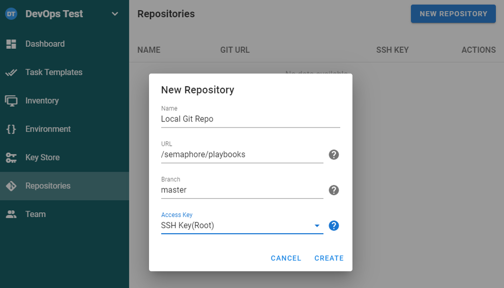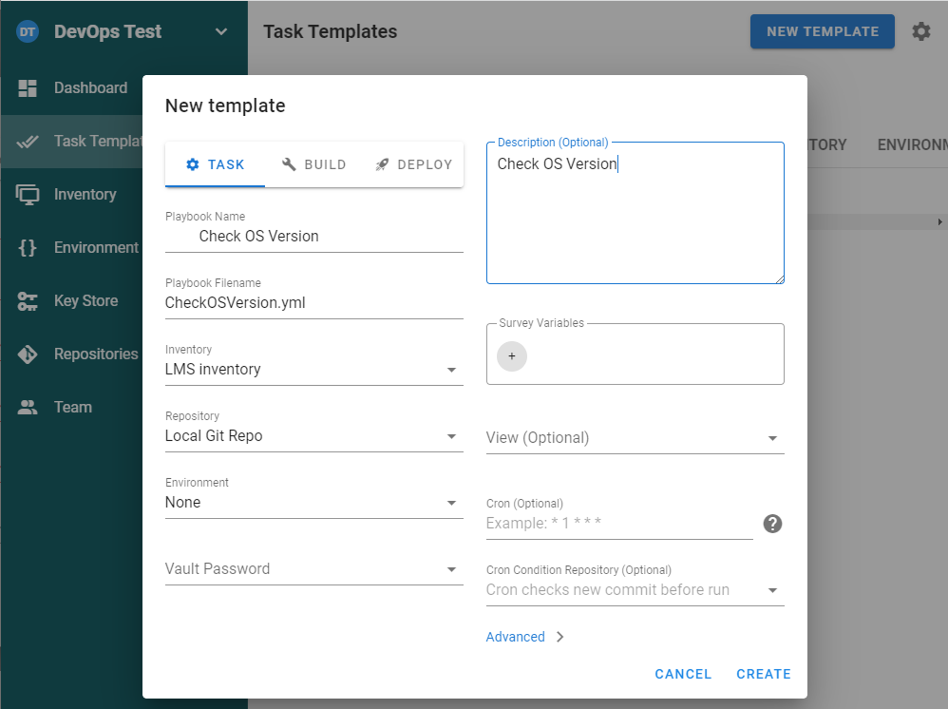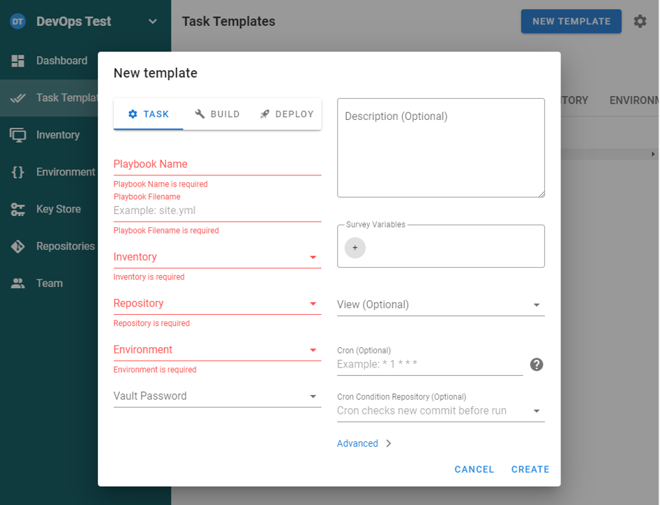 Task Templates을 만들기 위해서는 KeyStore / Environment / Repositories / Inventory이 필요합니다.