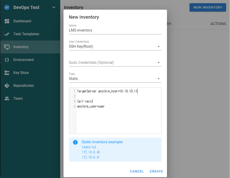 Inventory : 대상서버들의 목록(ansible의 Hosts 파일로 생각하면 됩니다.)