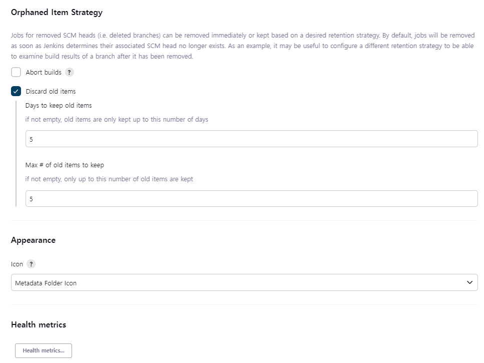 - Named branches get different properties : 이름 있는 브랜치는 다른 설정 사용 - 현재 유일한 설정은 SCM 트리거 무시로 해당 브랜치의 jenkins 커밋 트리거를 무시한다.