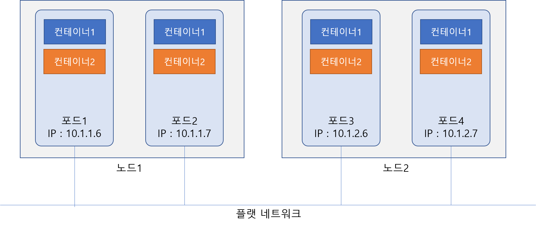 - 포드간에 통신은 항상 단순하다. 모든 포드는 1개의 플랫 네트워크에 위치하며, 다른 모든 포드에 액세스할 수 있다.