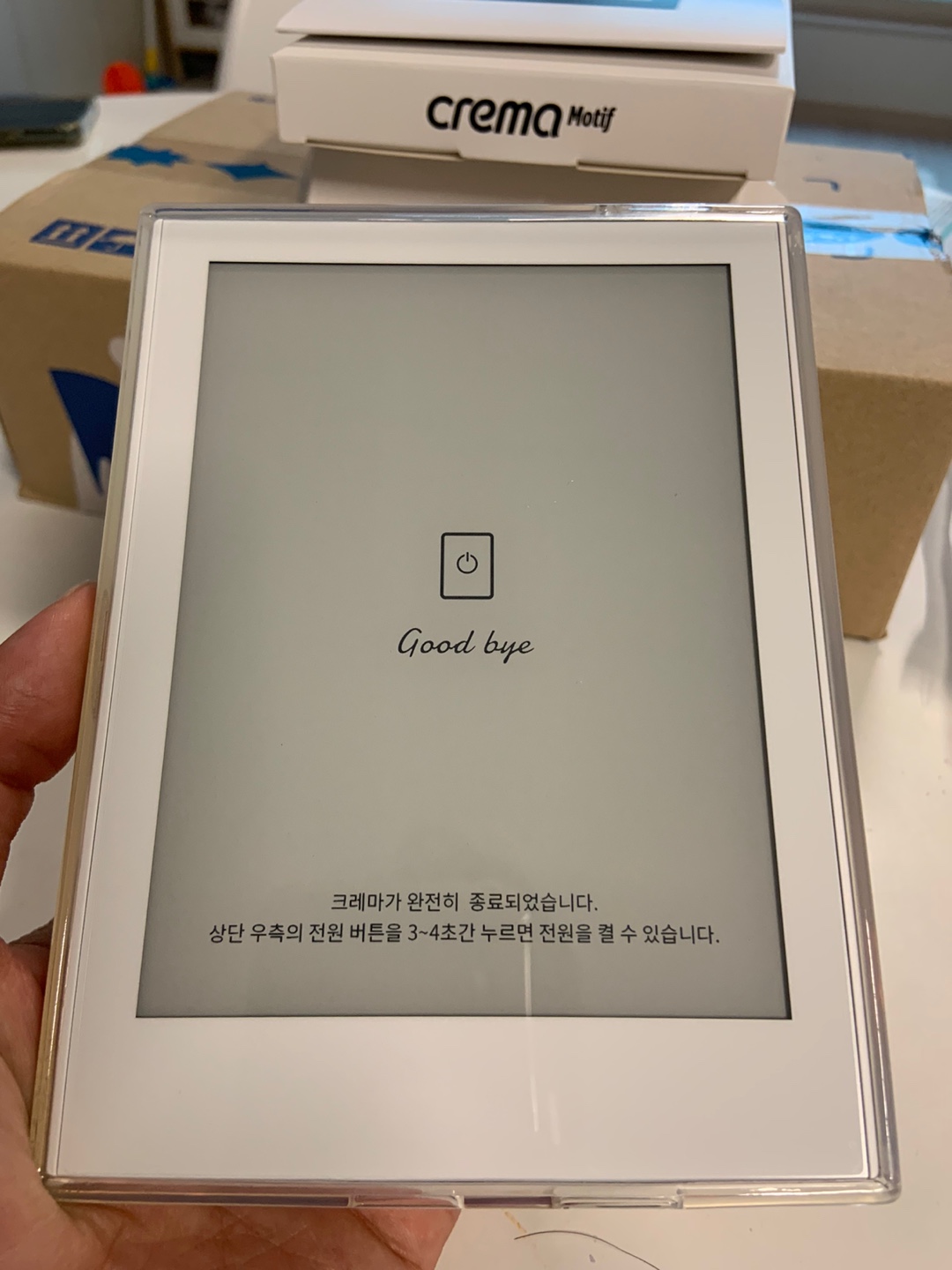 크레마를 종료했을때는 우측 사진처럼 Good Bye 표시가 선명하게 보입니다.