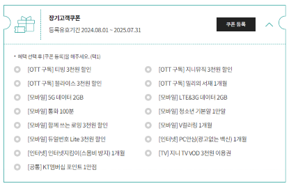 KT의 장기고객은 장기고객쿠폰을 통해서 1장당 1개월을 무료 구독이 가능합니다.