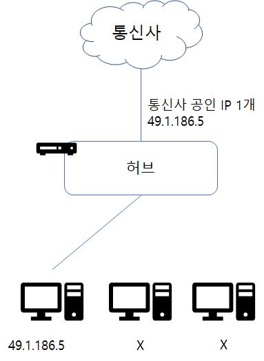 허브는 단순히 데이터가 지나가는 통로 역할로, 1개의 인터넷회선은 1개의 IP만 연결해서 사용할 수 있습니다.
