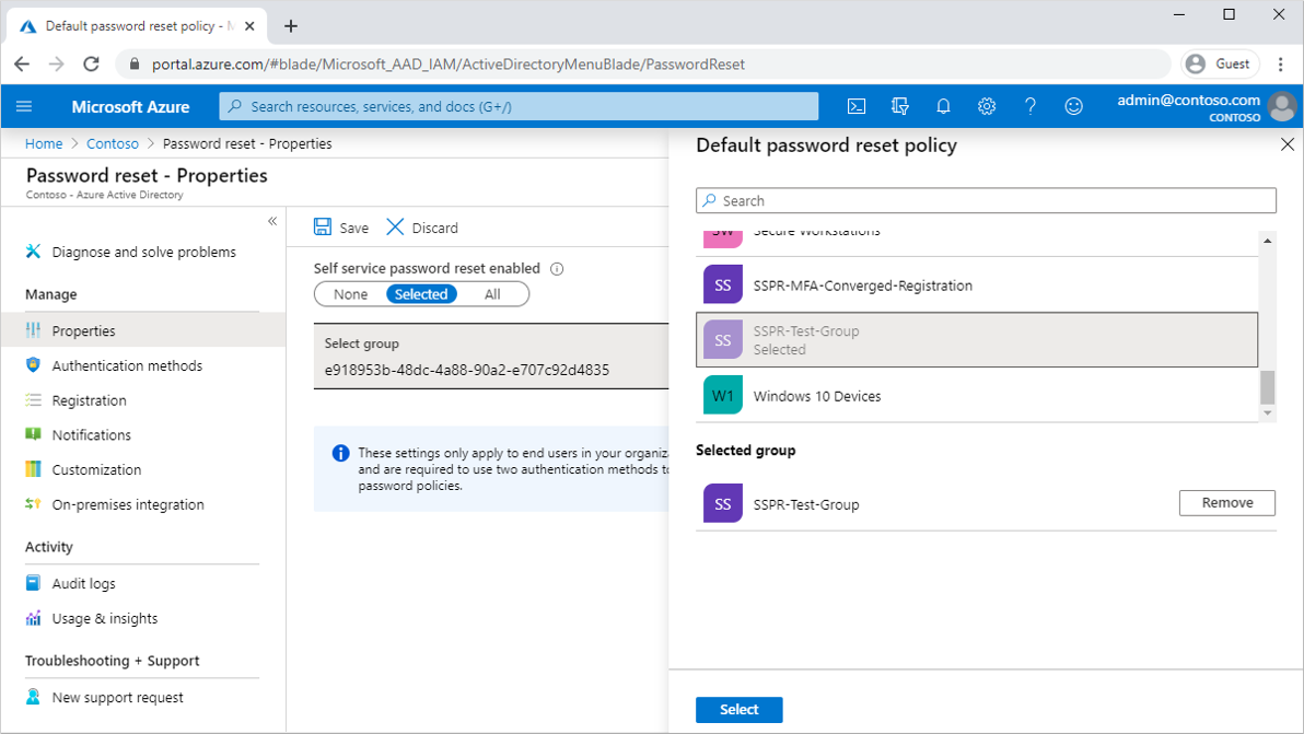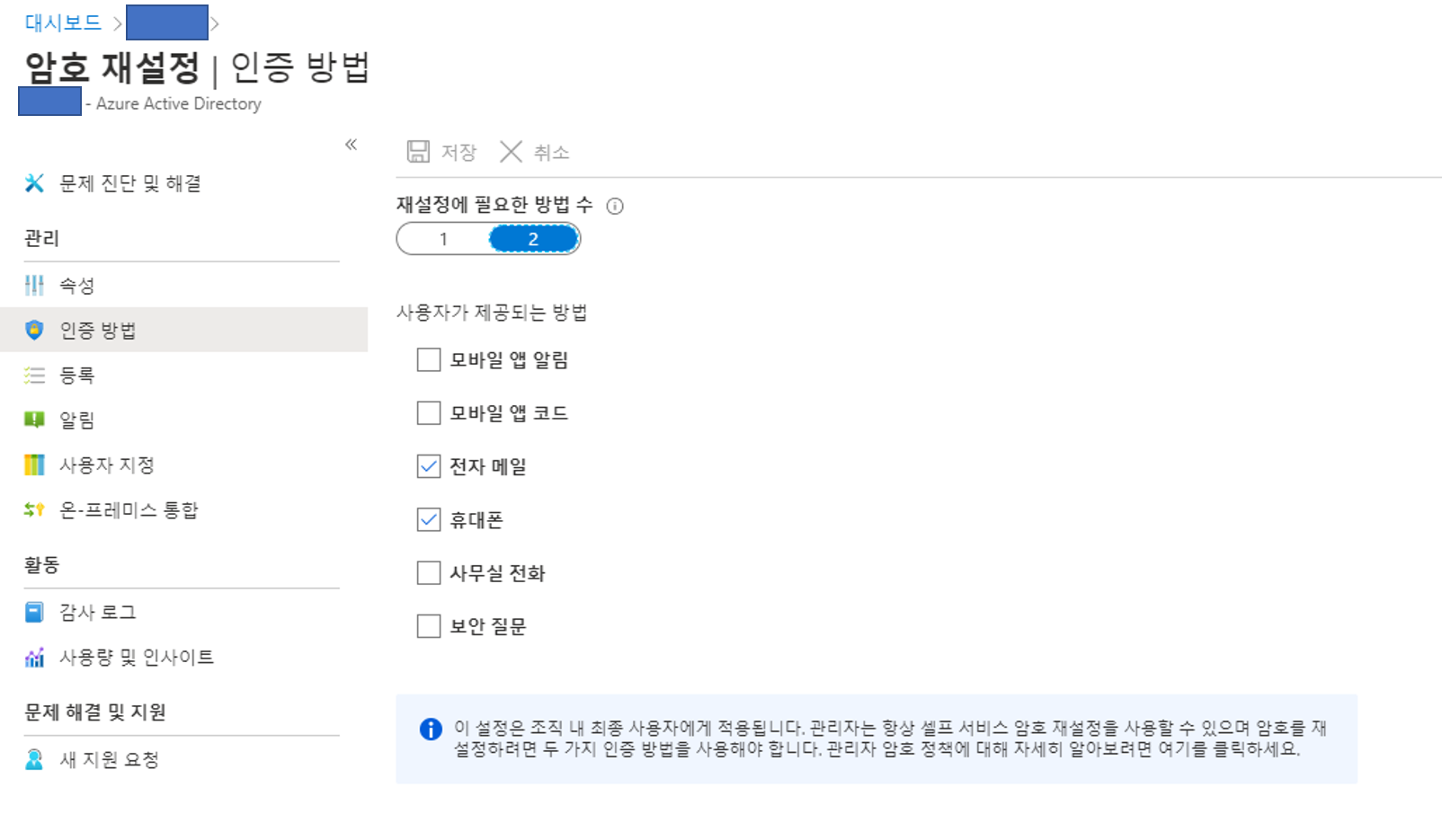 적용 경로 : Azure Portal > Azure Active Directory > 암호 재설정 > 속성